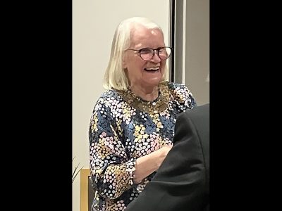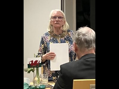 After an excellent dinner, Jennifer introduced her theme of “First impressions”, having invited several members to take the place of an external guest speaker by telling of their first experiences of the Society. Her own had resulted from a chance meeting at the school gate with Vice-President Valerie Baguley – “You need to join the Welsh Society” – which led to her attending a Noson Lawen at which Eirwen Stillie had brought her junior school class of girls in Welsh National costume to sing “Calon lân”. “We’ve arrived!” – the friendship from the Society had saved her life, and Jennifer soon joined the Committee and became Secretary in 1979.